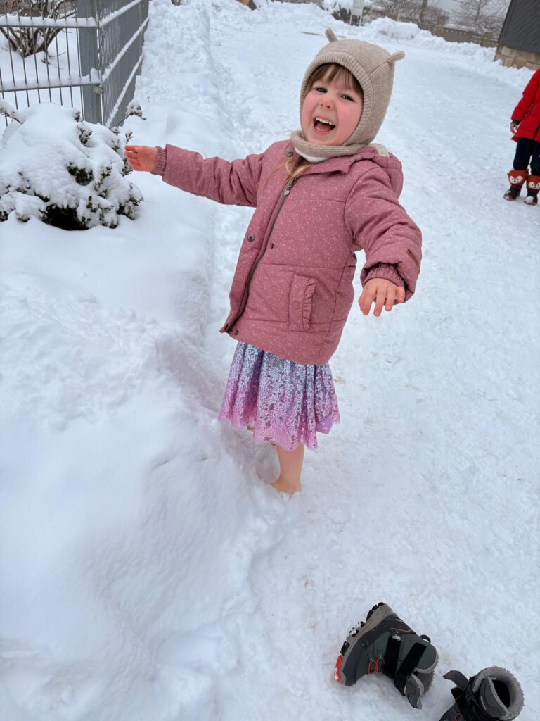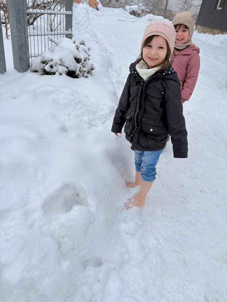 Ganz einfach: Jacke an, Mütze auf – Schuhe aus. Dann huschen die Kinder für ein paar Sekunden barfuß über den Schnee. Kein Marathon, kein Wettbewerb, sondern ein kurzes Kitzeln für die Füße. Danach heißt es: schnell wieder warm werden!