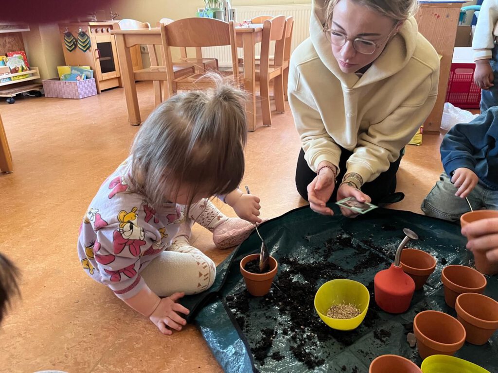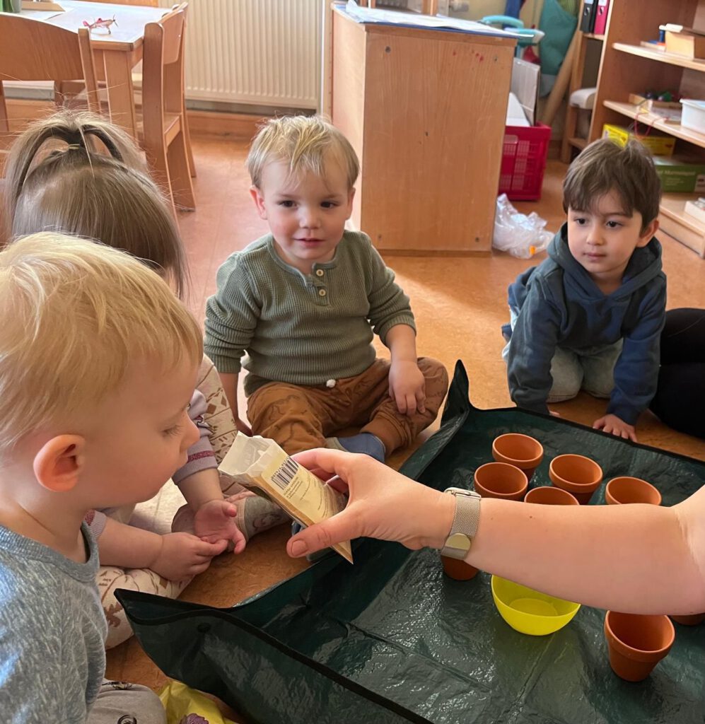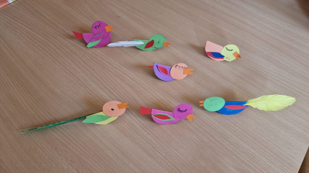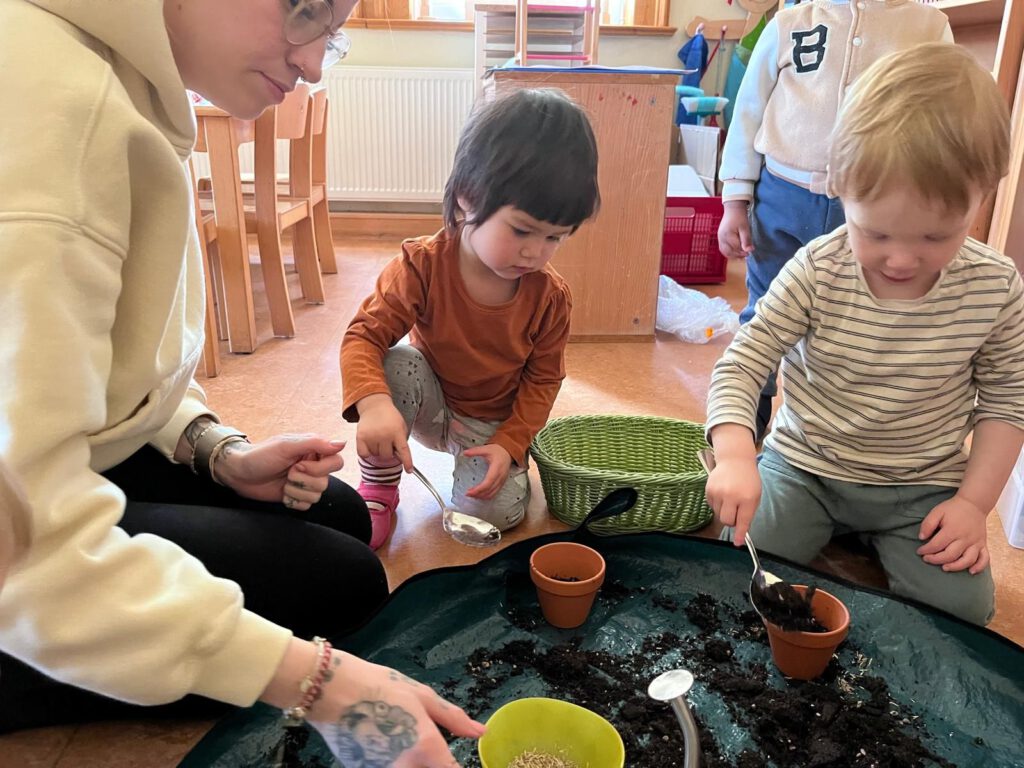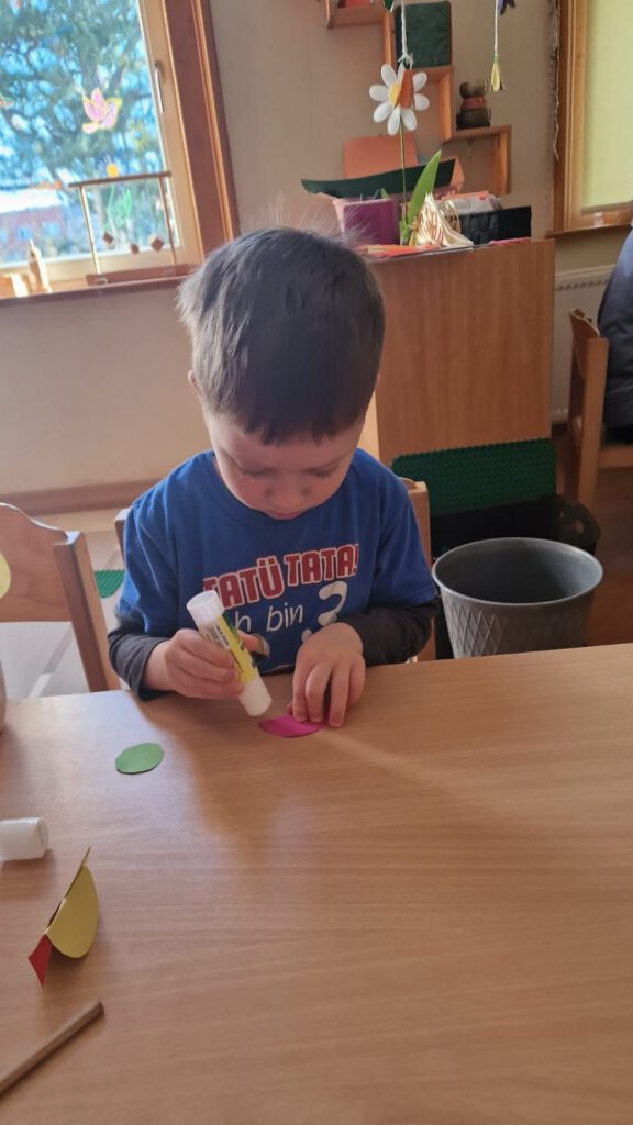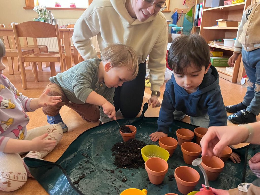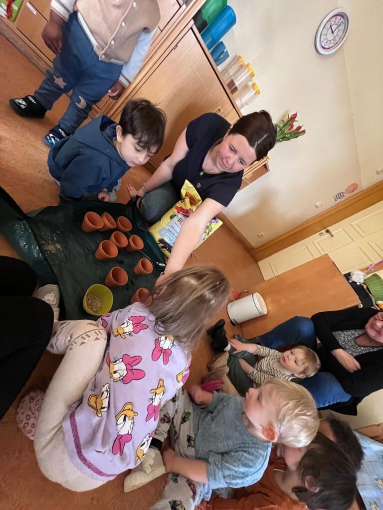 Mit viel Freude bastelten die Kinder bunte Vögel aus Papier. Dabei entstanden viele unterschiedliche kleine Kunstwerke, die nun den Gruppenraum schmücken. An einer weiteren Station durften die Kinder selbst kleine Töpfe mit Grassamen bepflanzen. Nun heißt es: gut pflegen, regelmäßig gießen und beobachten, wie nach und nach das erste Grün wächst.