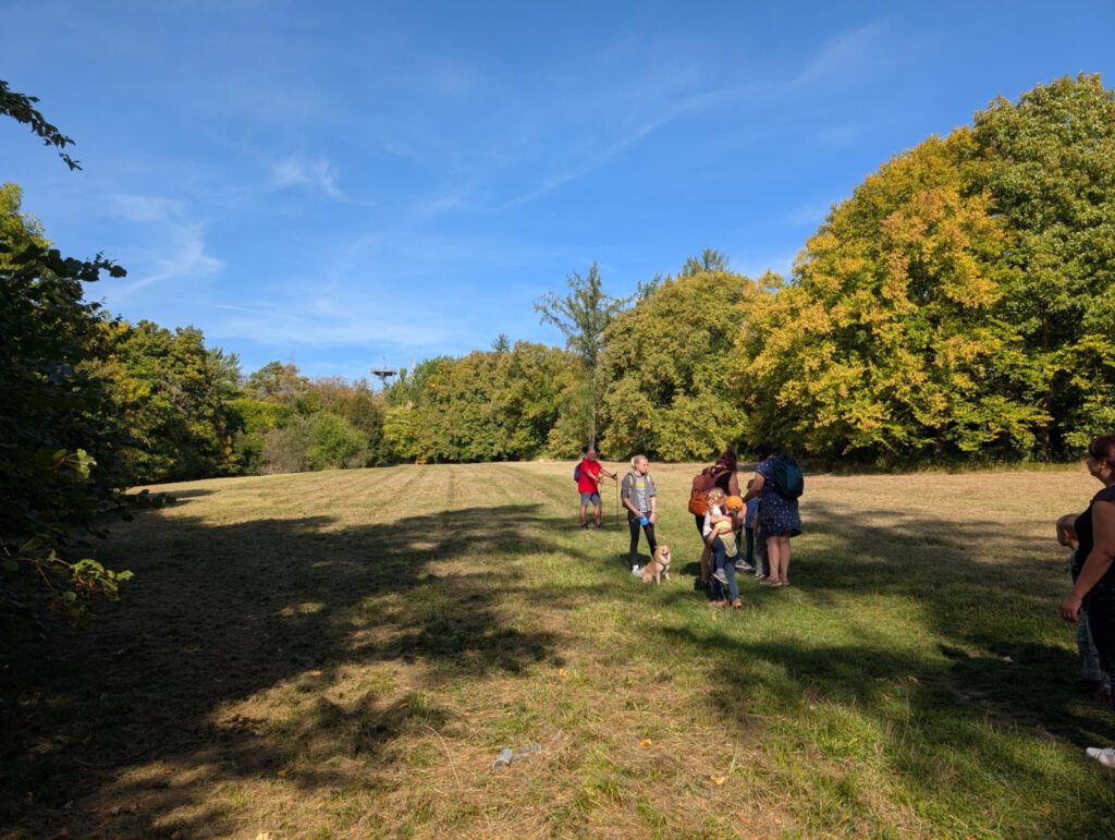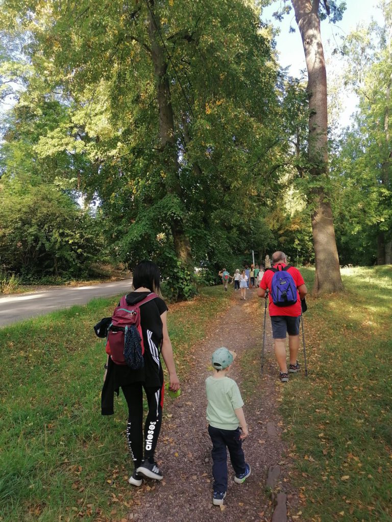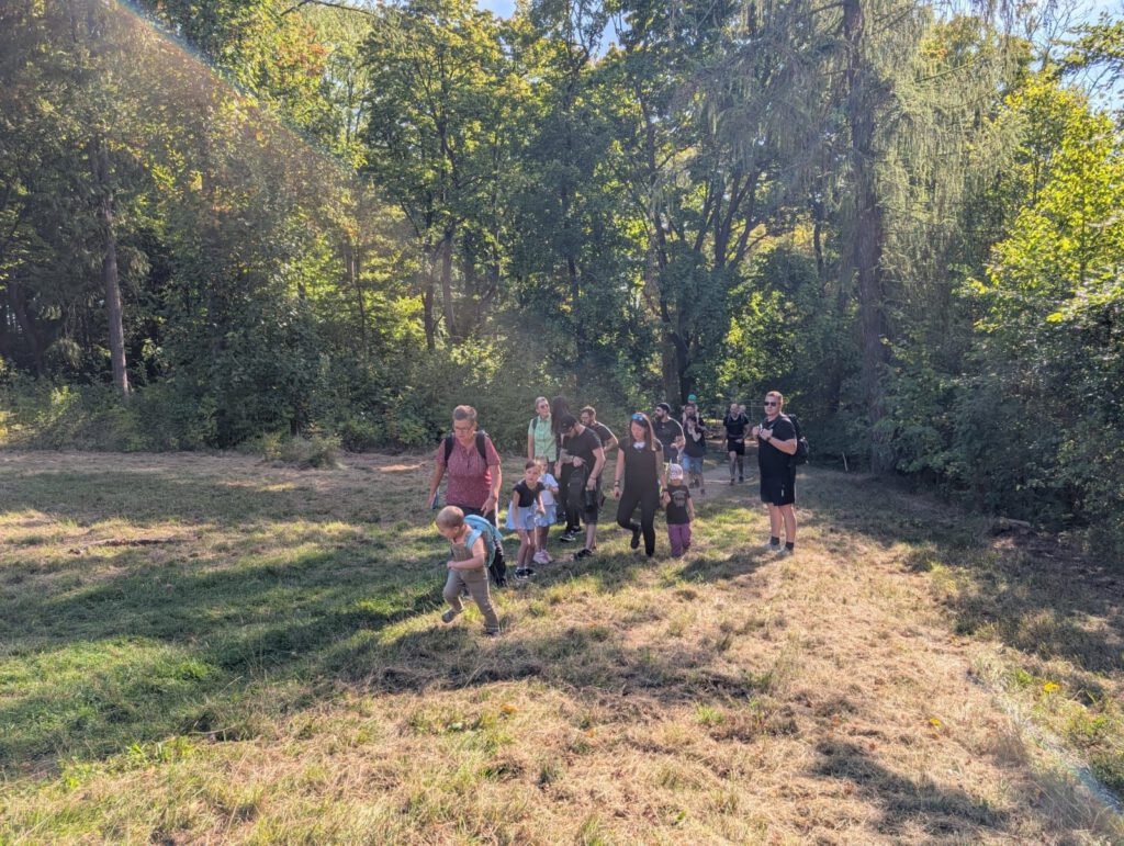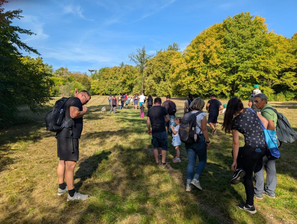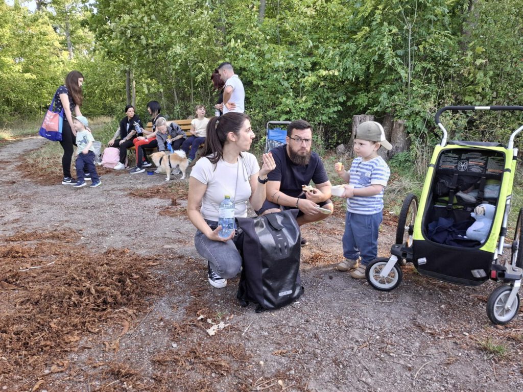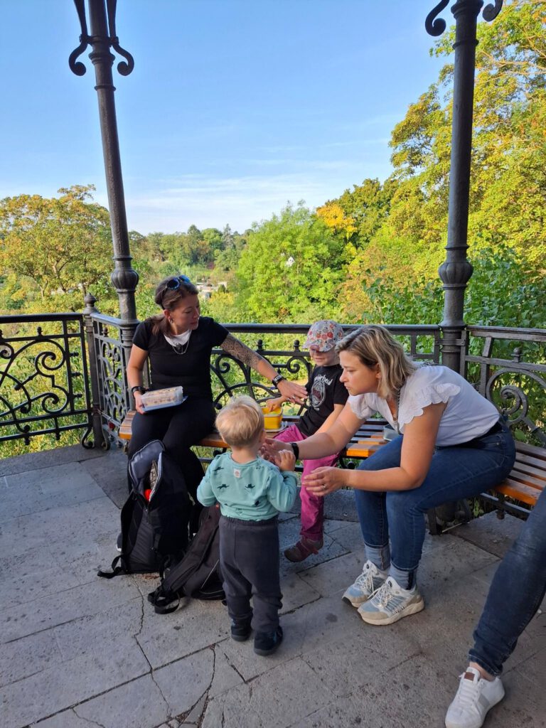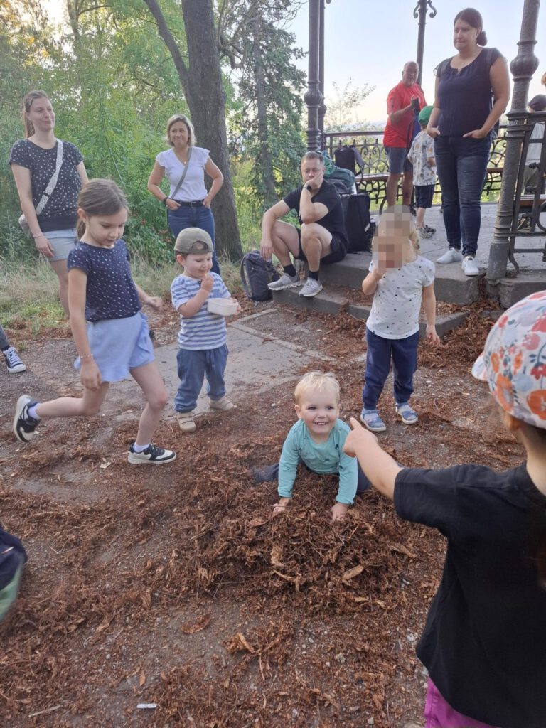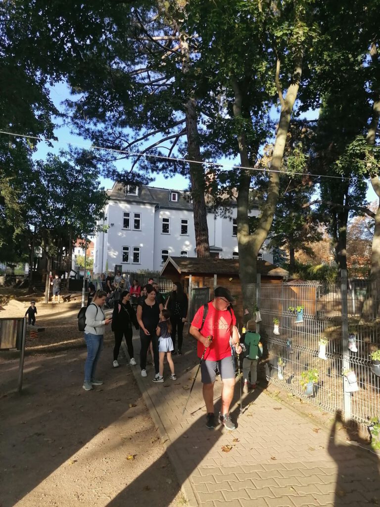 Frisch gestärkt ging es dann weiter durch die herbstliche Natur. Der Weg führte die Gruppe schließlich zur zweiten Rast am Spielplatz im Berggarten. Hier konnten sich die Kinder nach Herzenslust austoben, während die Erwachsenen die Sonne und die gemeinsame Zeit genossen.