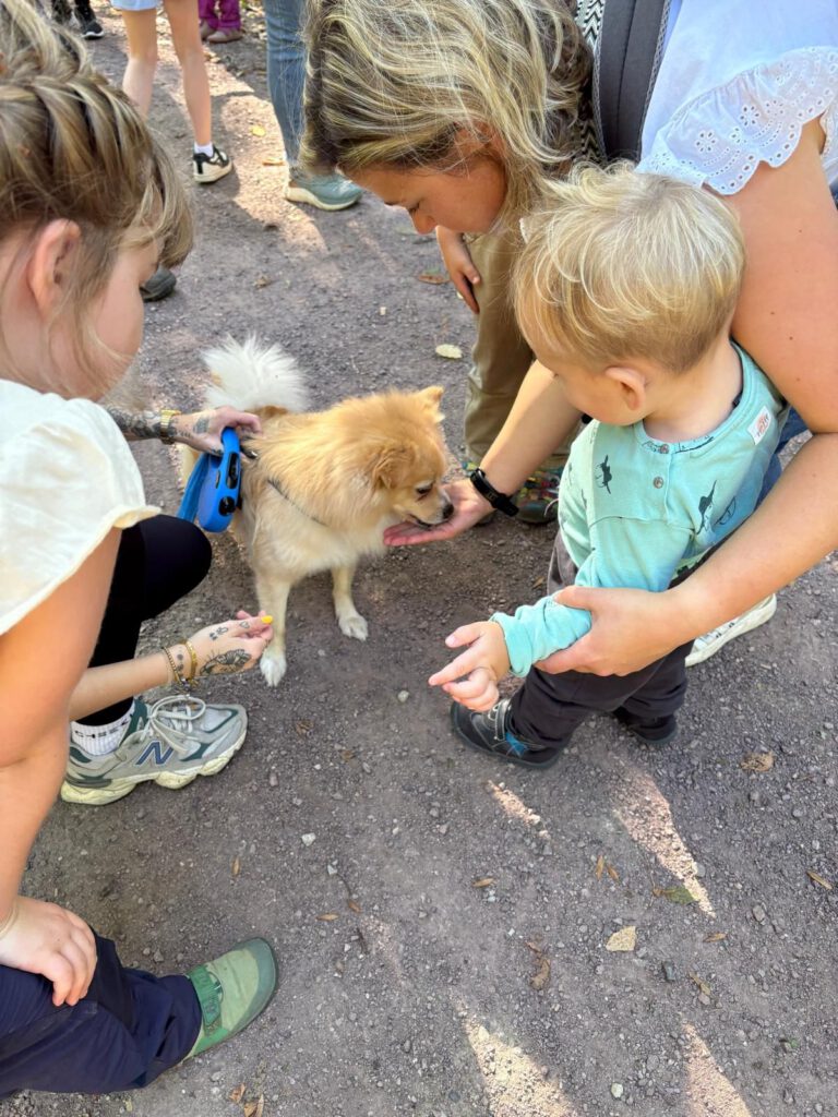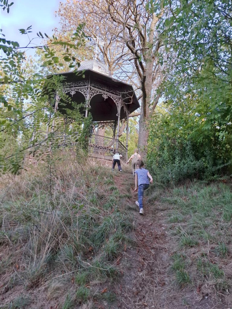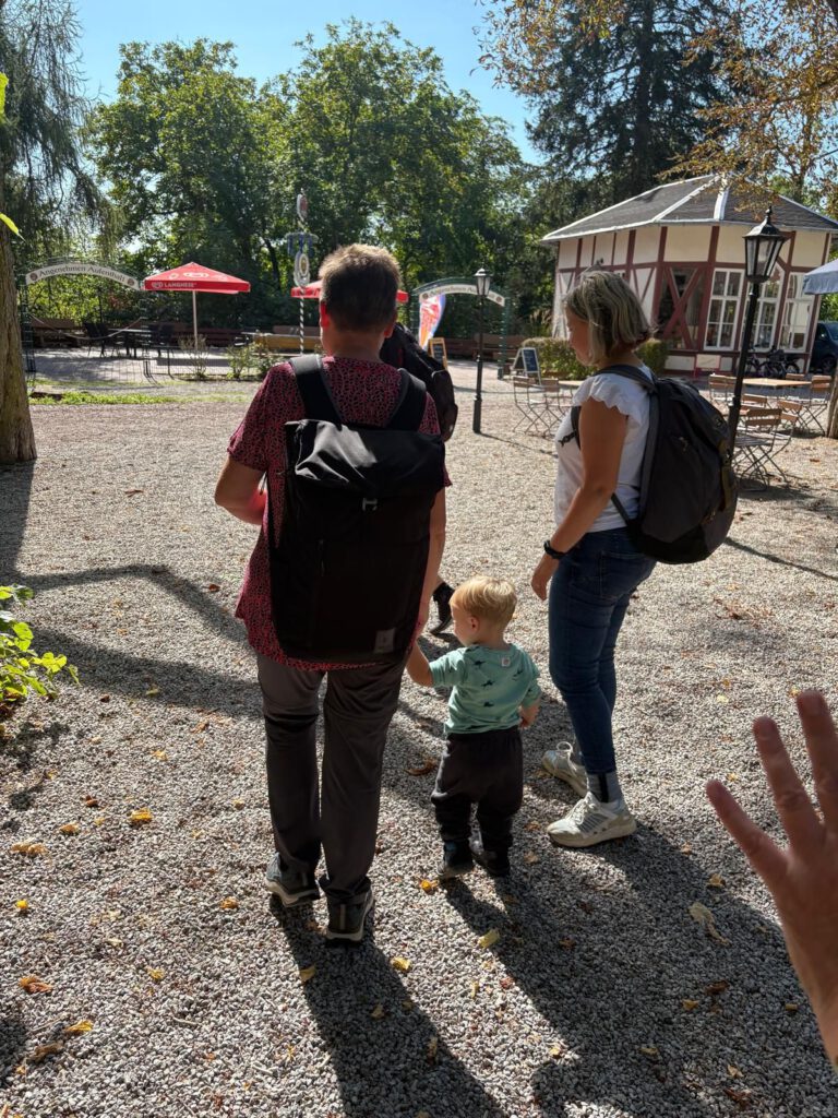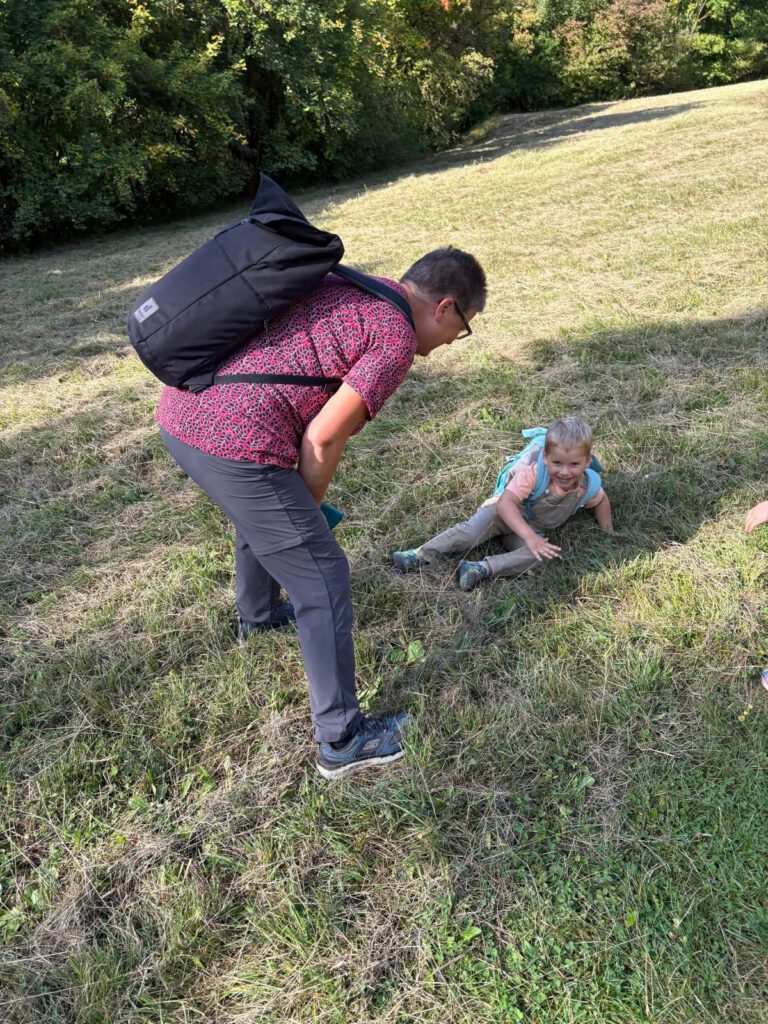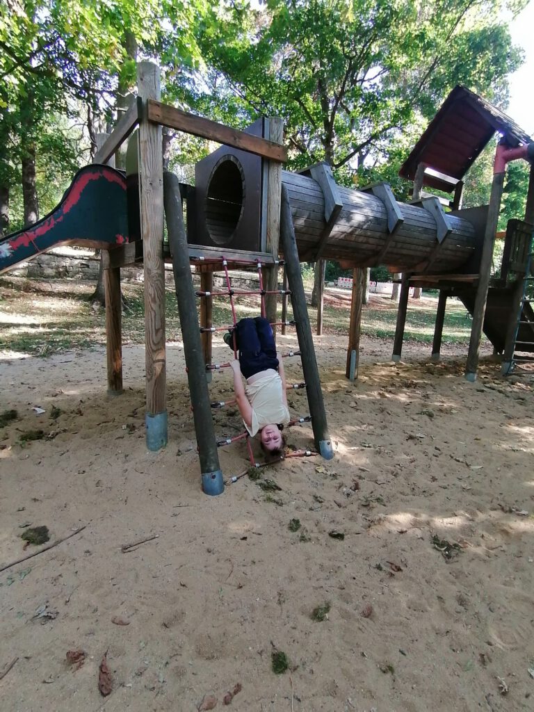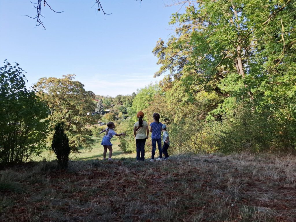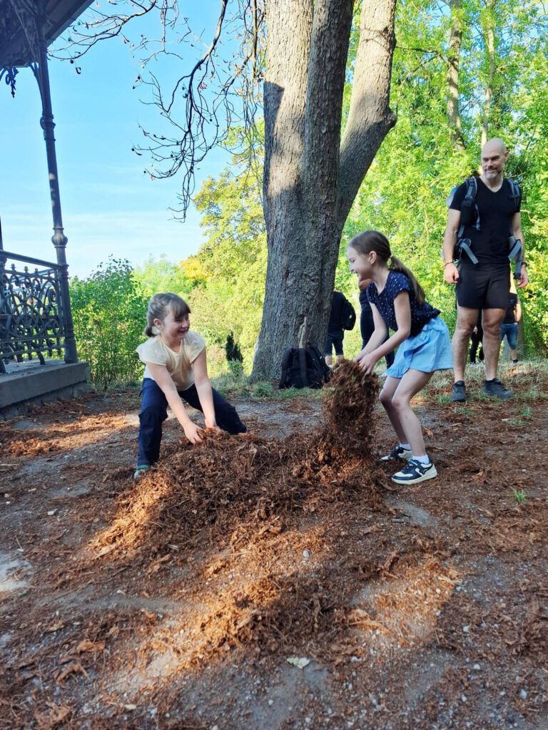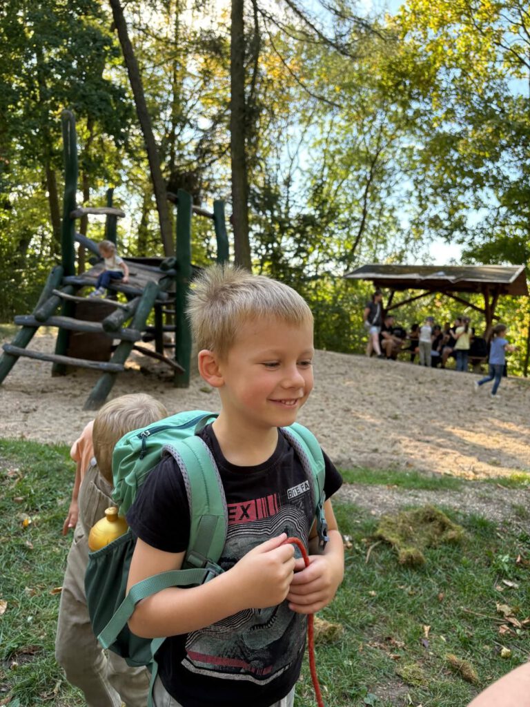 Frisch gestärkt ging es dann weiter durch die herbstliche Natur. Der Weg führte die Gruppe schließlich zur zweiten Rast am Spielplatz im Berggarten. Hier konnten sich die Kinder nach Herzenslust austoben, während die Erwachsenen die Sonne und die gemeinsame Zeit genossen.