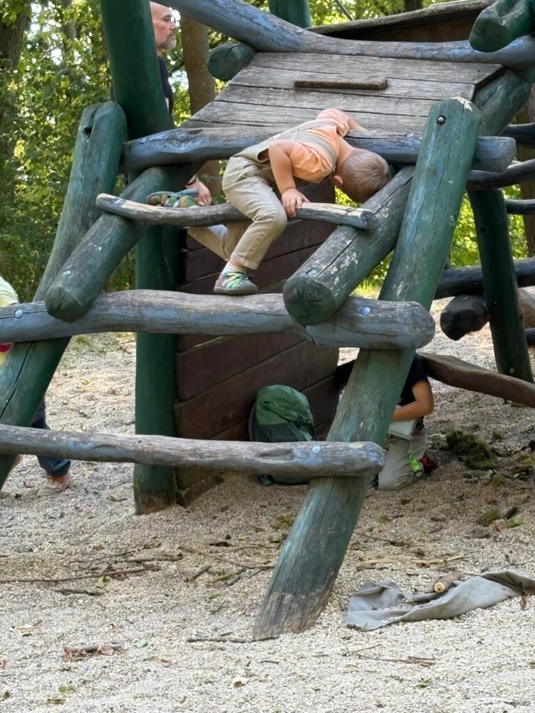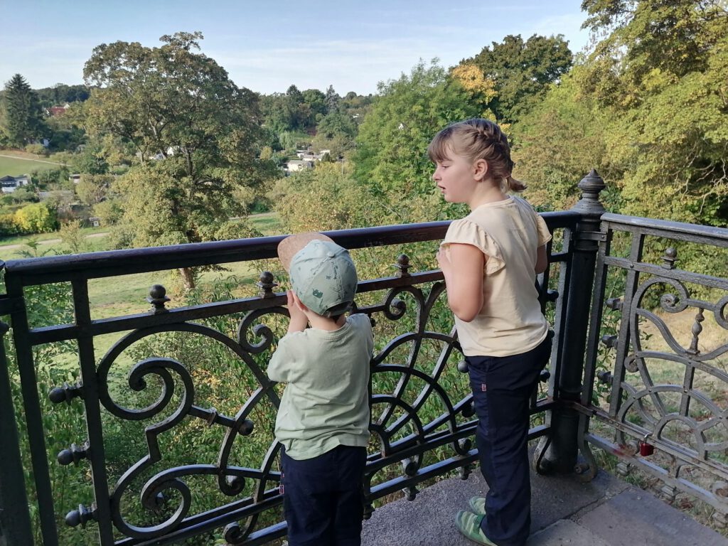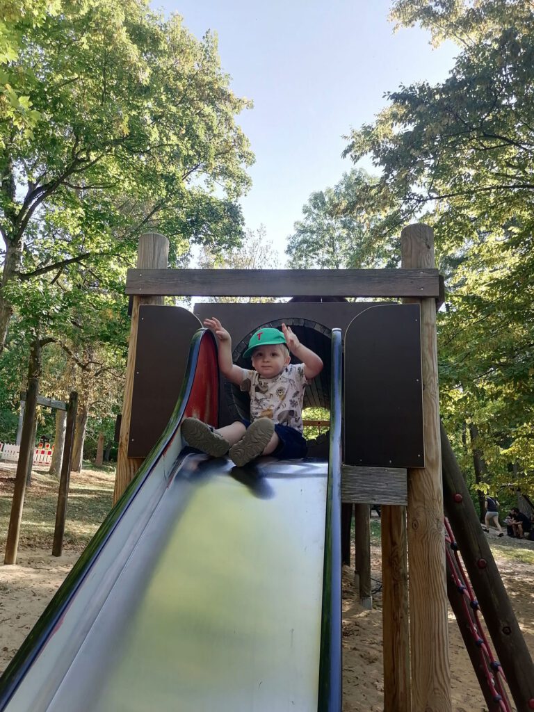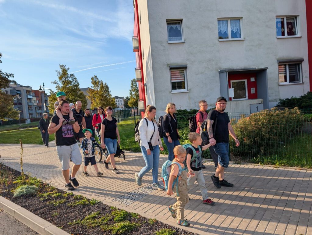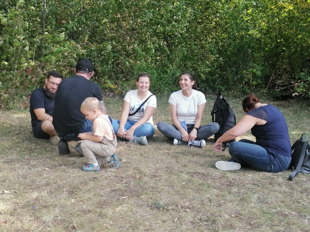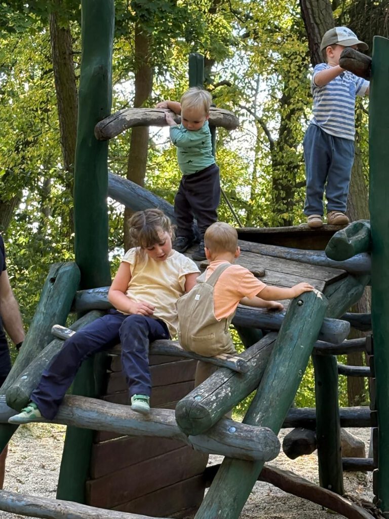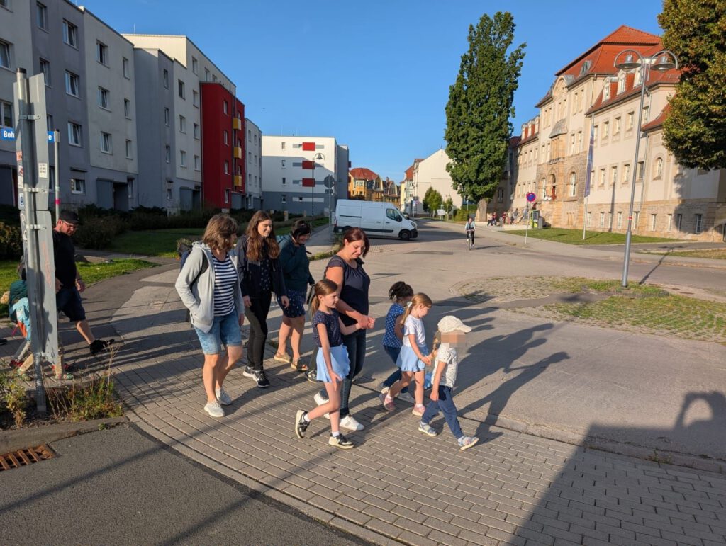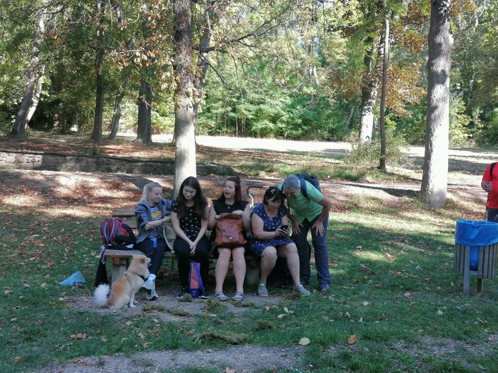 Frisch gestärkt ging es dann weiter durch die herbstliche Natur. Der Weg führte die Gruppe schließlich zur zweiten Rast am Spielplatz im Berggarten. Hier konnten sich die Kinder nach Herzenslust austoben, während die Erwachsenen die Sonne und die gemeinsame Zeit genossen.