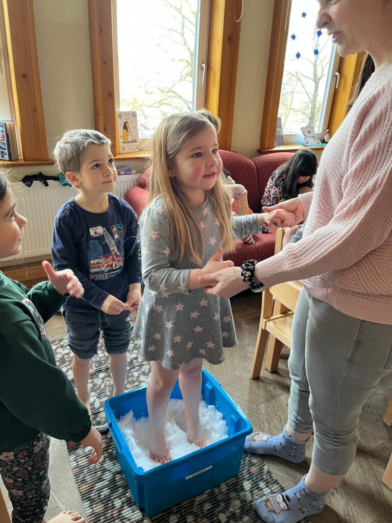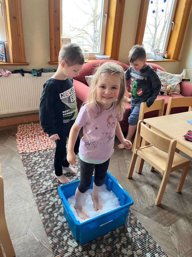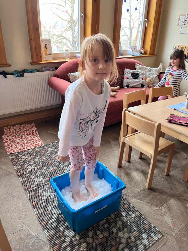 Ein echtes Highlight war für viele Kinder das Fußtreten im Schnee. Barfuß im kalten Weiß spürten sie die intensive Kälte auf der Haut und hinterließen lachend ihre Spuren. Neben dem aufregenden Erlebnis wurde dabei auch die Durchblutung angeregt und das Immunsystem gestärkt