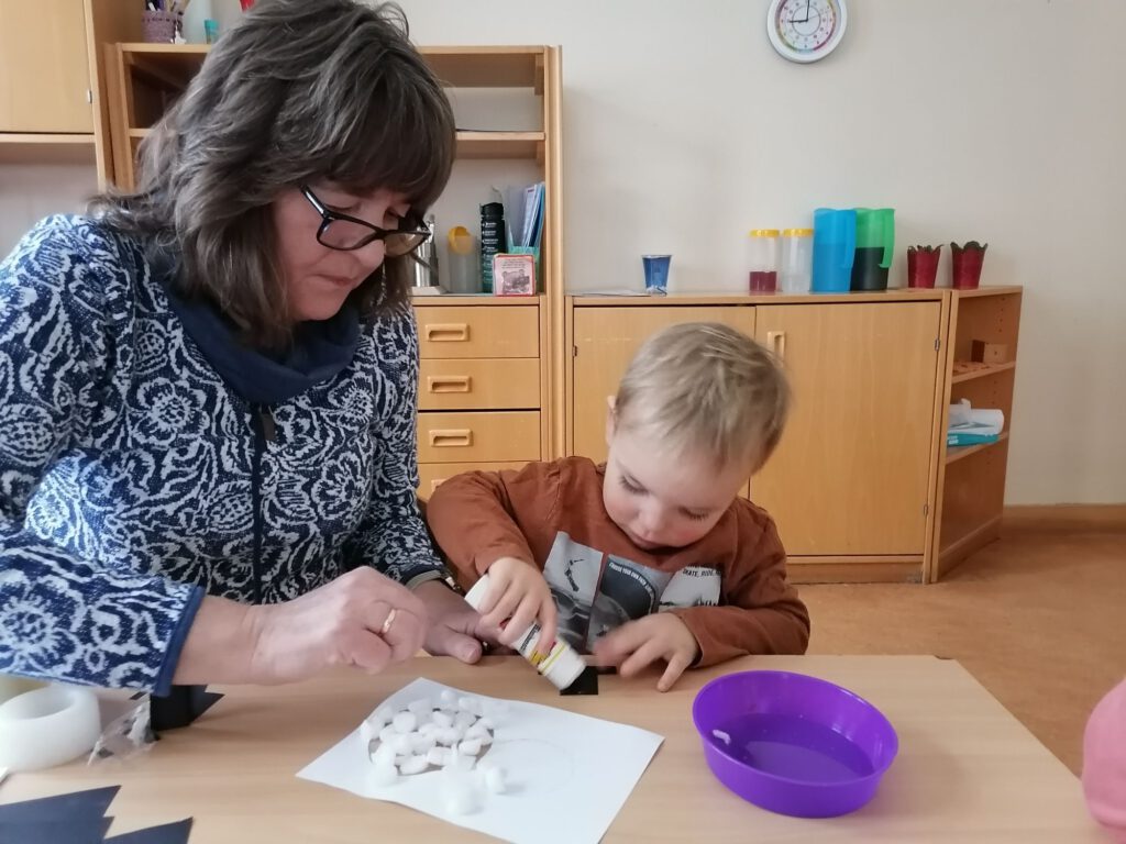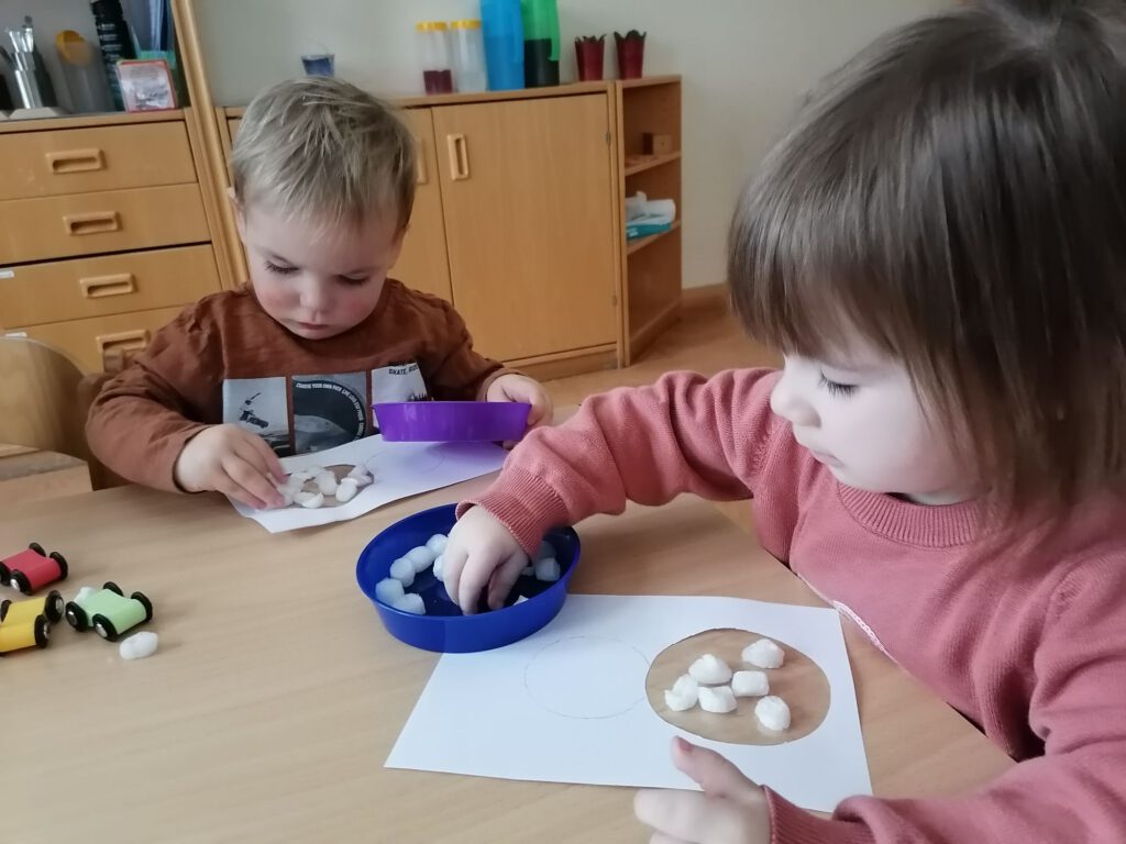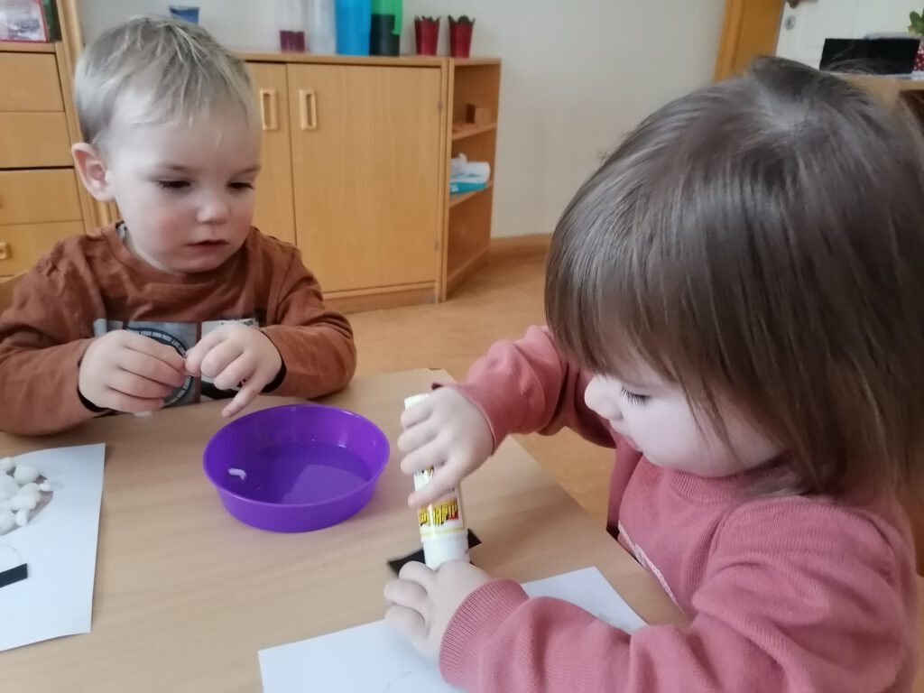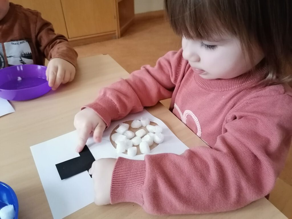 Zunächst wird aus Styroporflocken der Bauch des Schneemanns gestaltet. Die Flocken werden auf eine Fläche gelegt mit transparentem Klebeband , sodass eine runde Form entsteht. Dabei können die Kinder aktiv mithelfen, fühlen, drücken und beobachten, wie aus einzelnen Flocken ein Schneemannbauch wird.