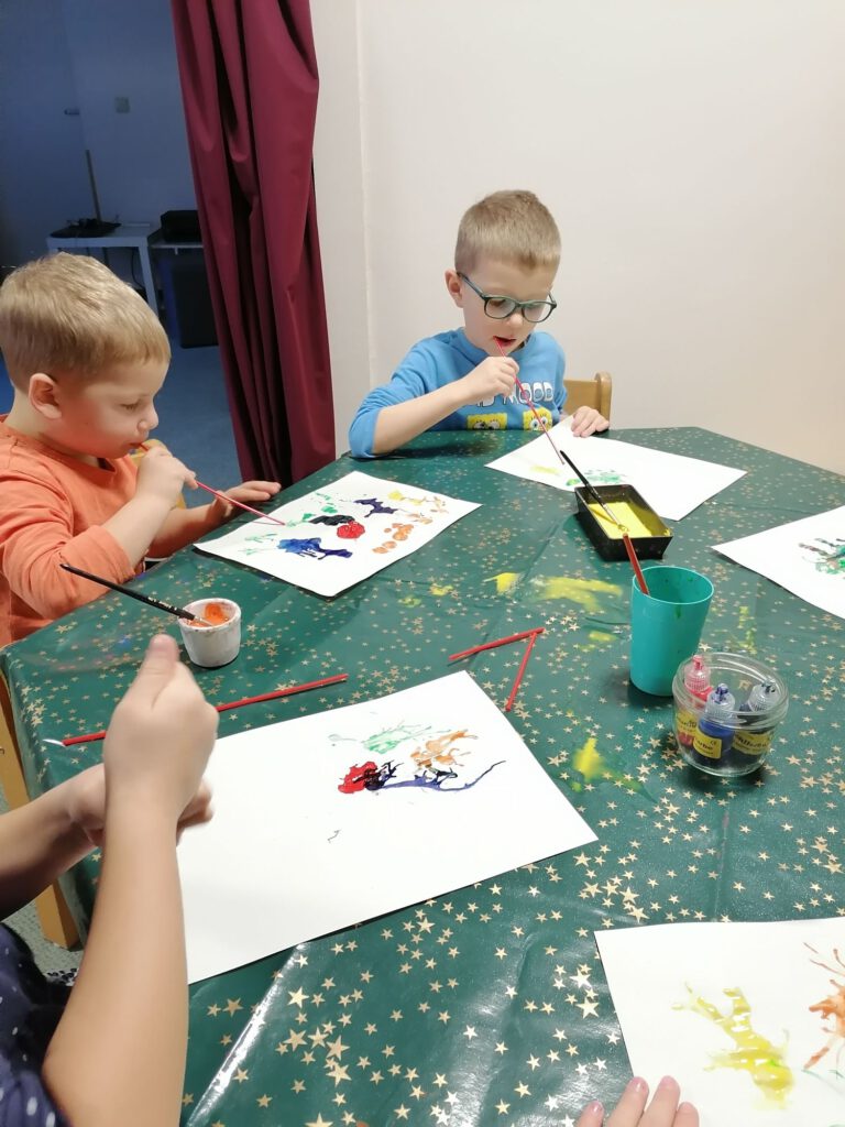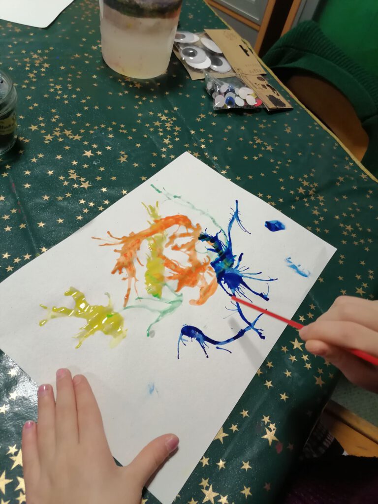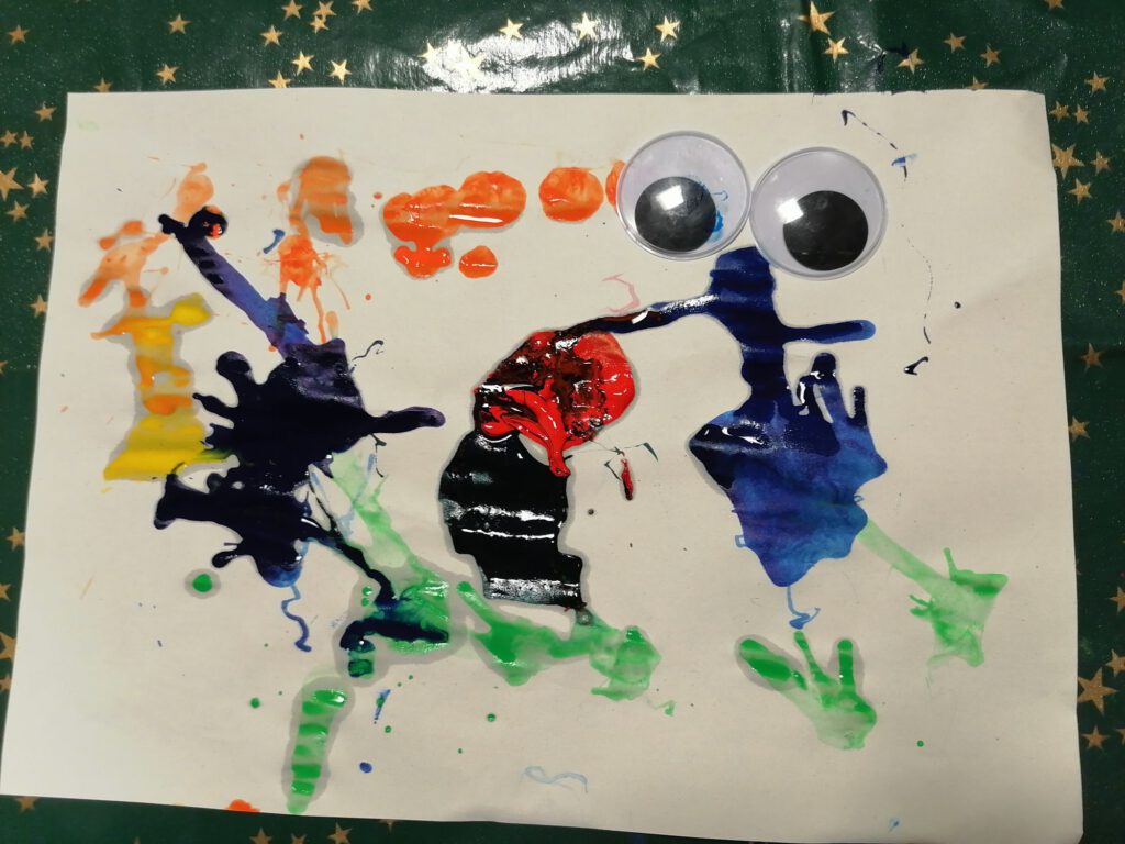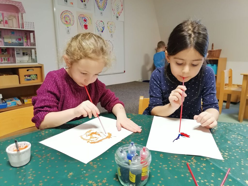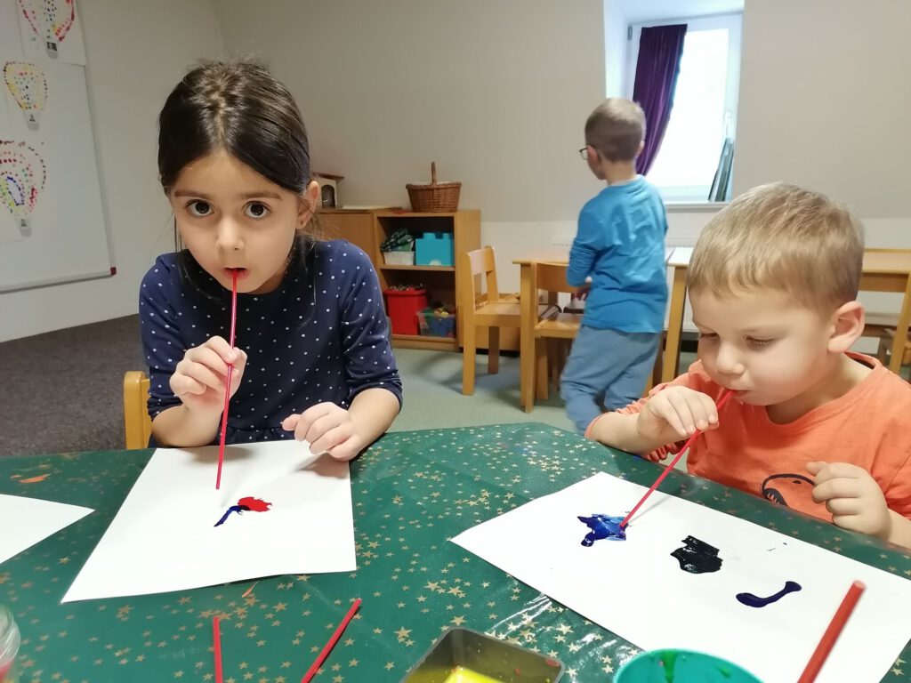 Die Kinder träufeln mit Stempelfarbe kleine Farbkleckse auf ein Blatt Papier. Anschließend pusten sie die Farbe vorsichtig mit einem Trinkhalm über das Papier. So entstehen ganz zufällig verrückte Linien und Formen – perfekte Grundlagen für fantasievolle Monster.