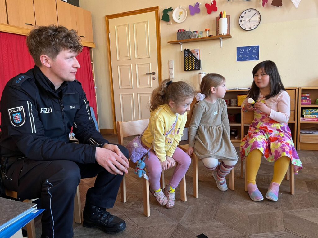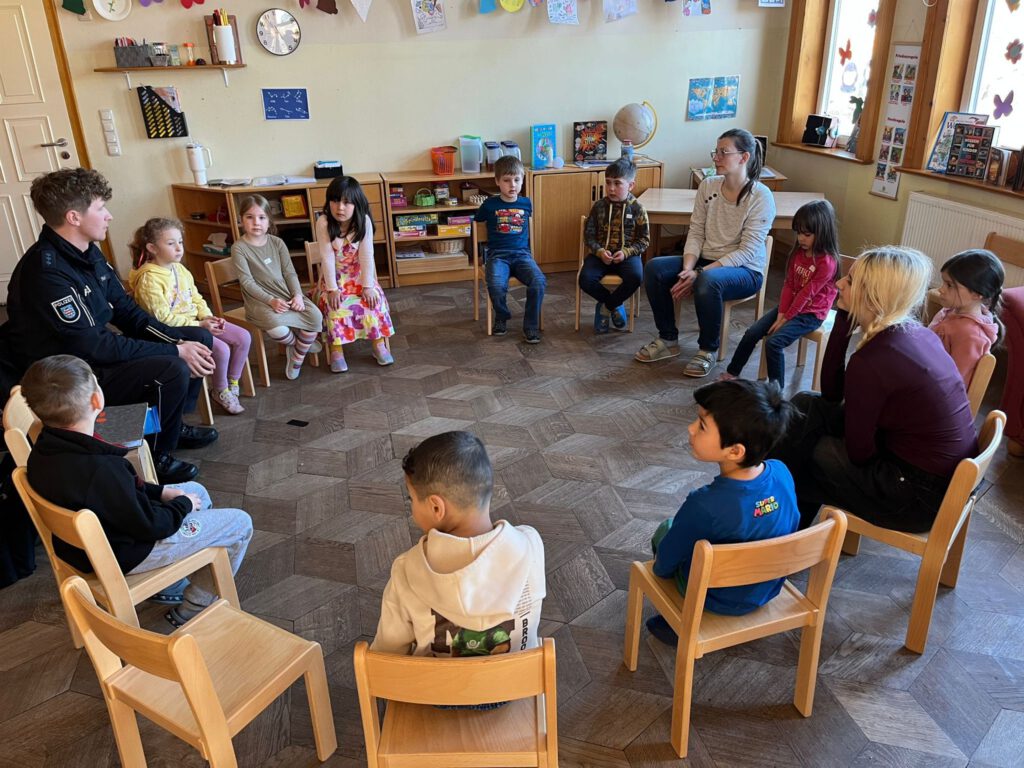 👮🏻♂️Herr Thiel, von der Polizeidienststelle Gotha, zeigte den Kindern zuerst, was ein Polizist bei einem Einsatz alles bei sich trägt. Die Kinder staunten über die vielen Gegenstände und hörten aufmerksam zu, während er jedes Teil ausführlich erklärte.