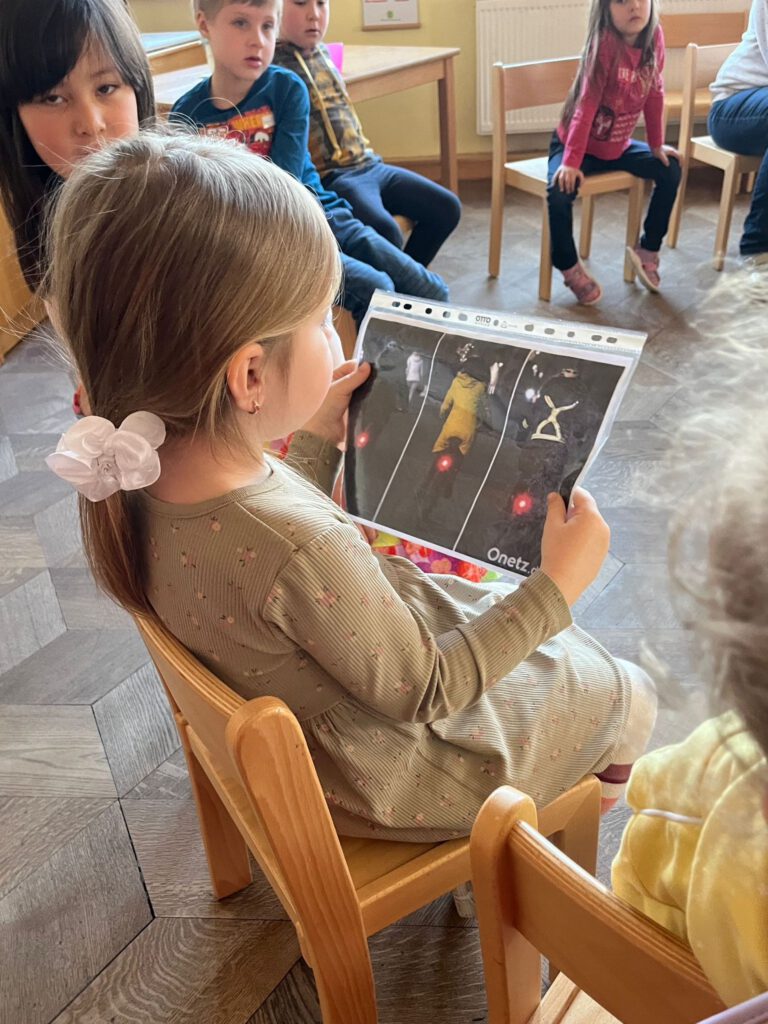 Schnell erkannten die Kinder, dass auch an ihren Schulranzen Reflektoren angebracht sind, damit sie im Straßenverkehr besser gesehen werden. Wir sprachen darüber, warum Sichtbarkeit so wichtig ist und wo man überall Reflektoren finden kann.