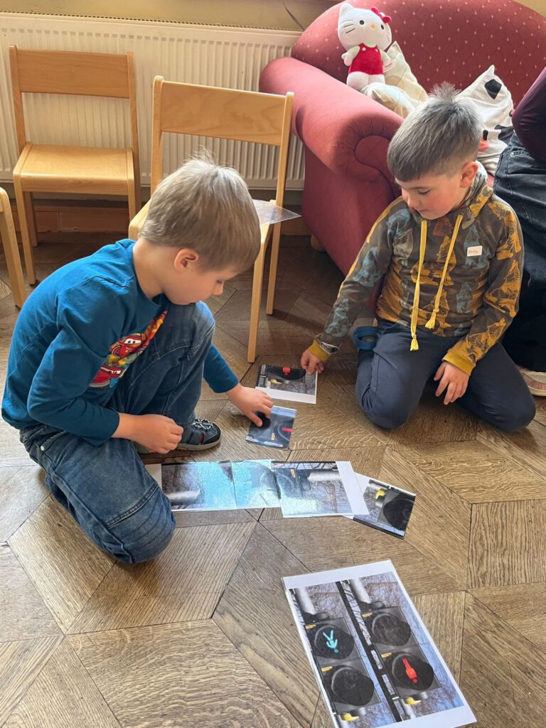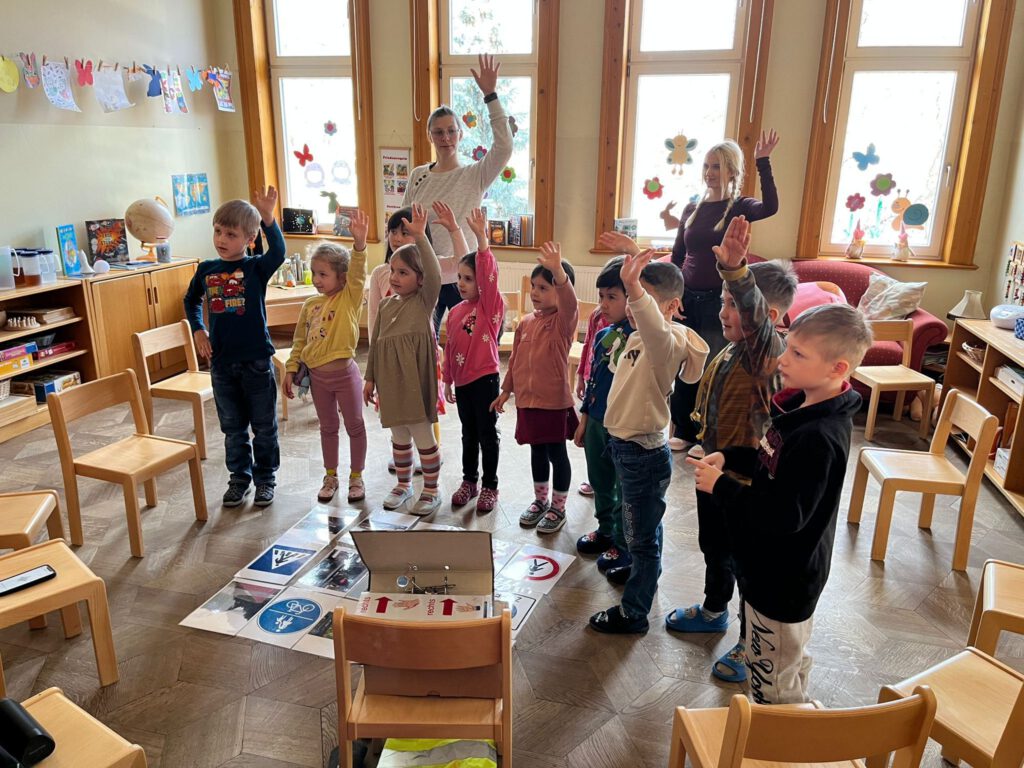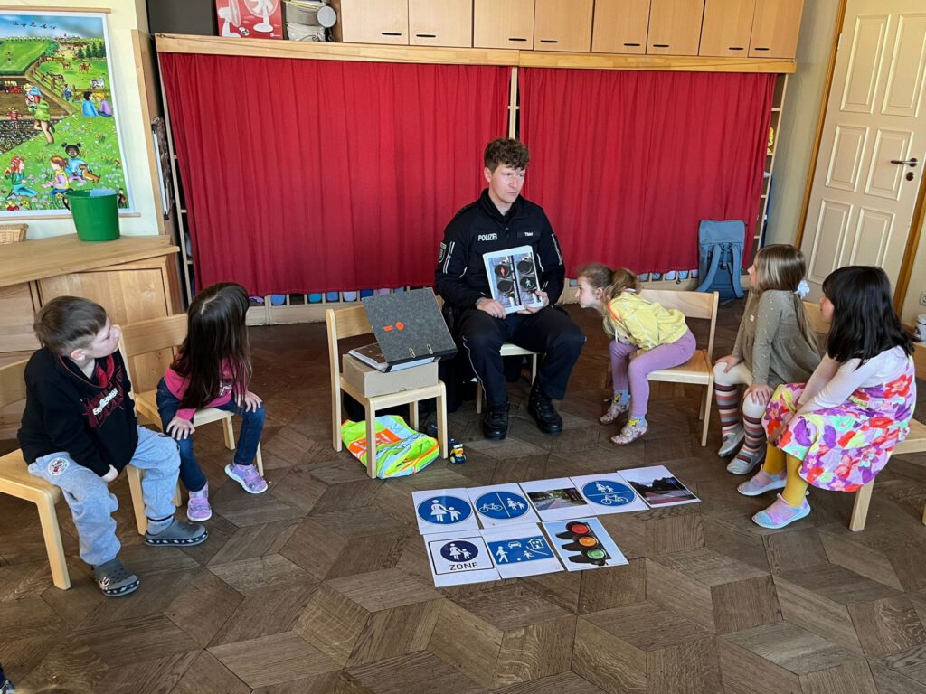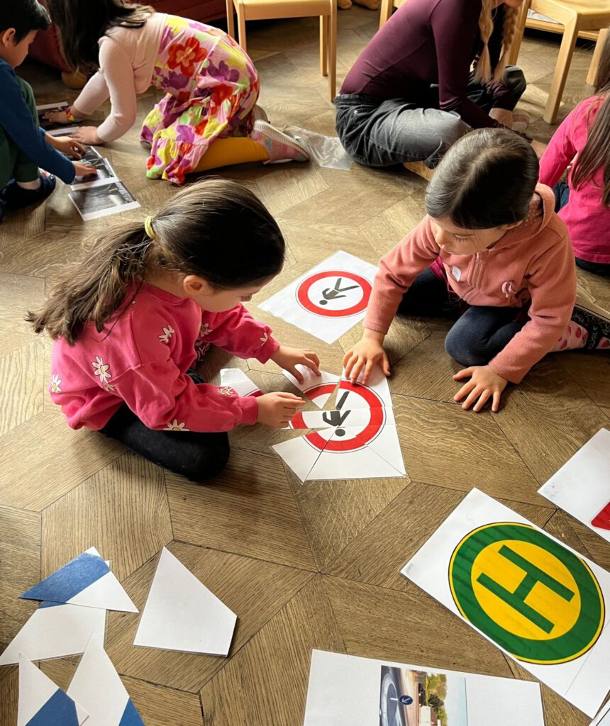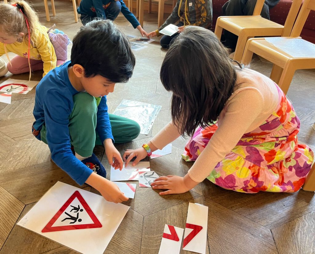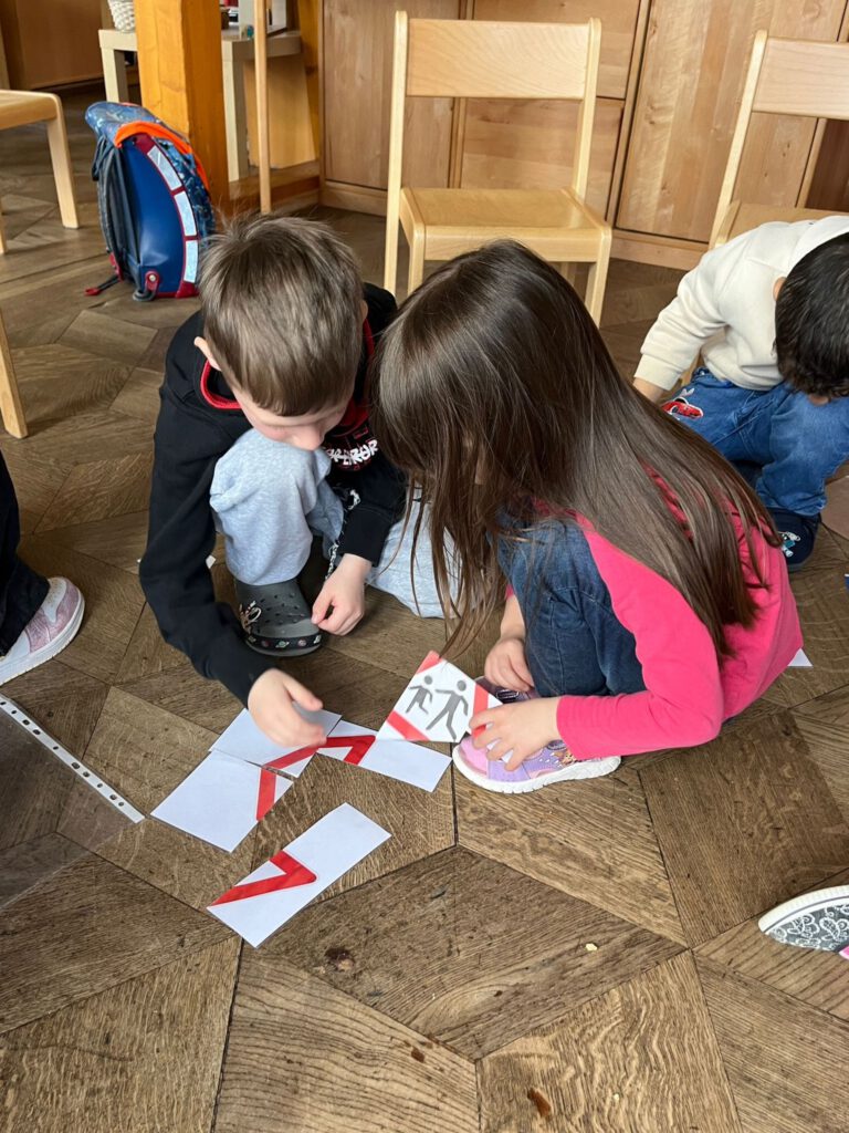 Danach wiederholten wir verschiedene Verkehrszeichen, die den Kindern bereits gut bekannt waren. Darunter Spielstraße, Fußgängerzone und die Ampel. Die Kinder konnten ihr Wissen einbringen und zeigten großes Interesse an allem, was mit dem Straßenverkehr zu tun hat.