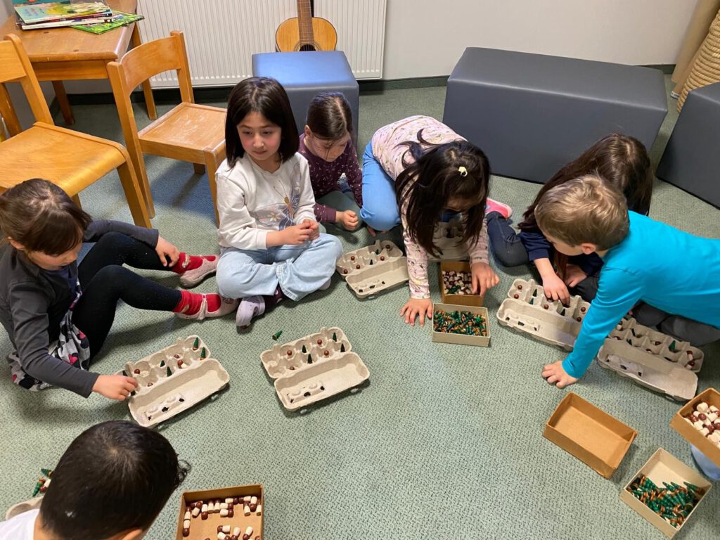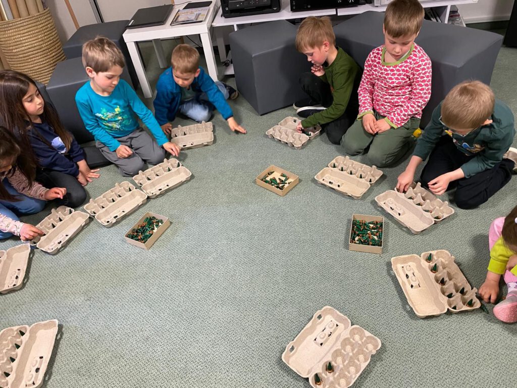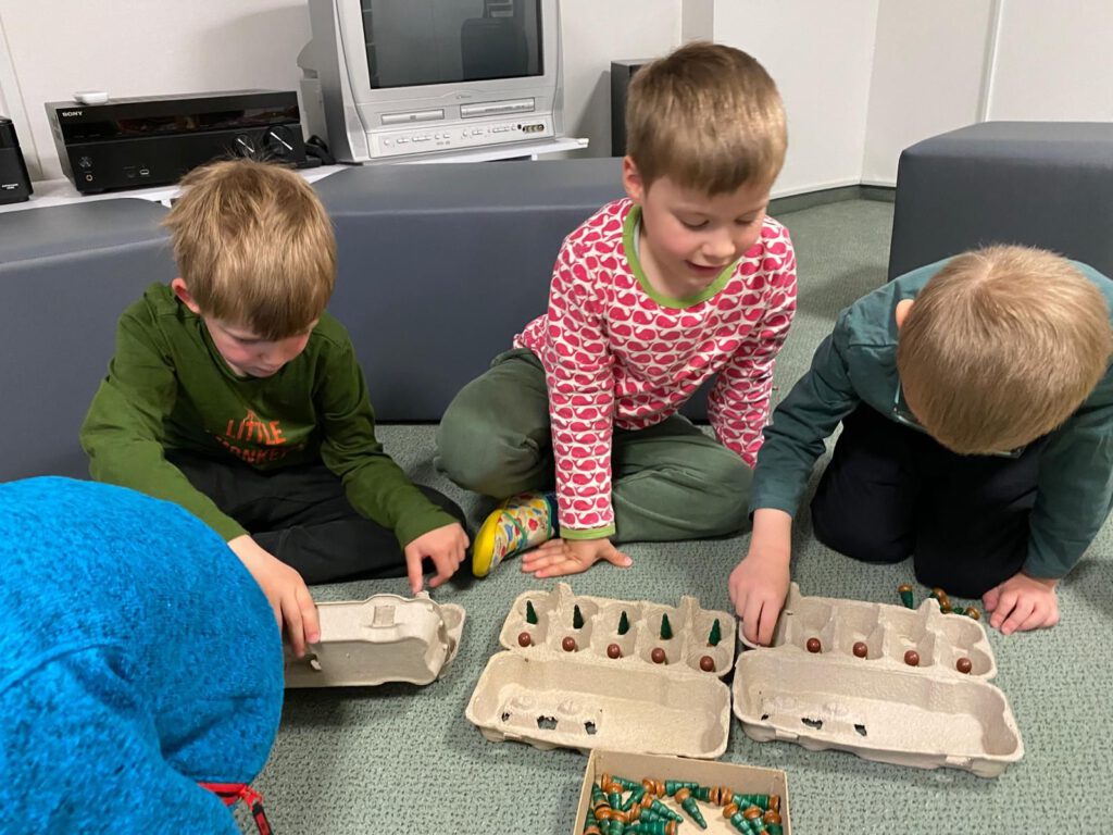 Im Anschluss wurde es ganz praktisch: Spielerisch haben wir uns dem Zahlenraum bis zehn genähert. Mit natürlichen Materialien und viel Bewegung haben die Kinder gezählt, Mengen verglichen und sortiert. Ob beim Ordnen von Gegenständen, beim Zuordnen von Zahlen oder beim gemeinsamen Entdecken von „mehr“ und „weniger“ – das Lernen geschah ganz nebenbei und mit viel Freude.
