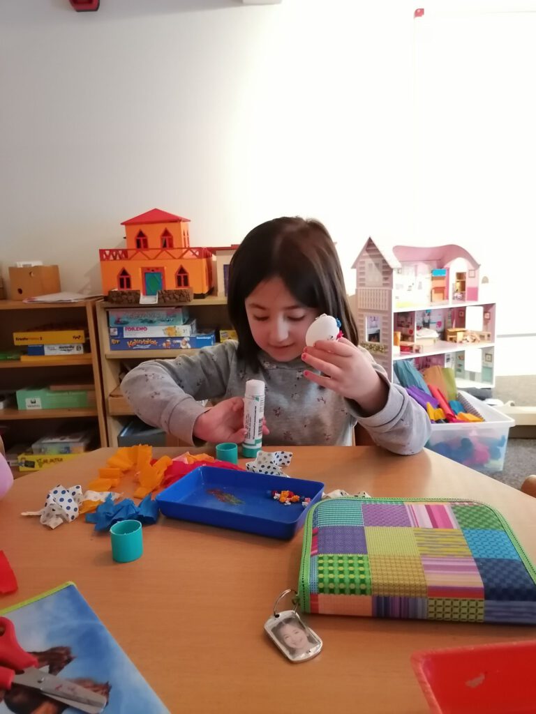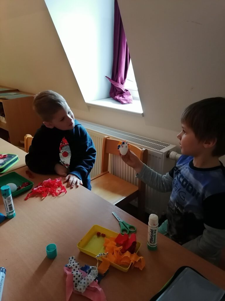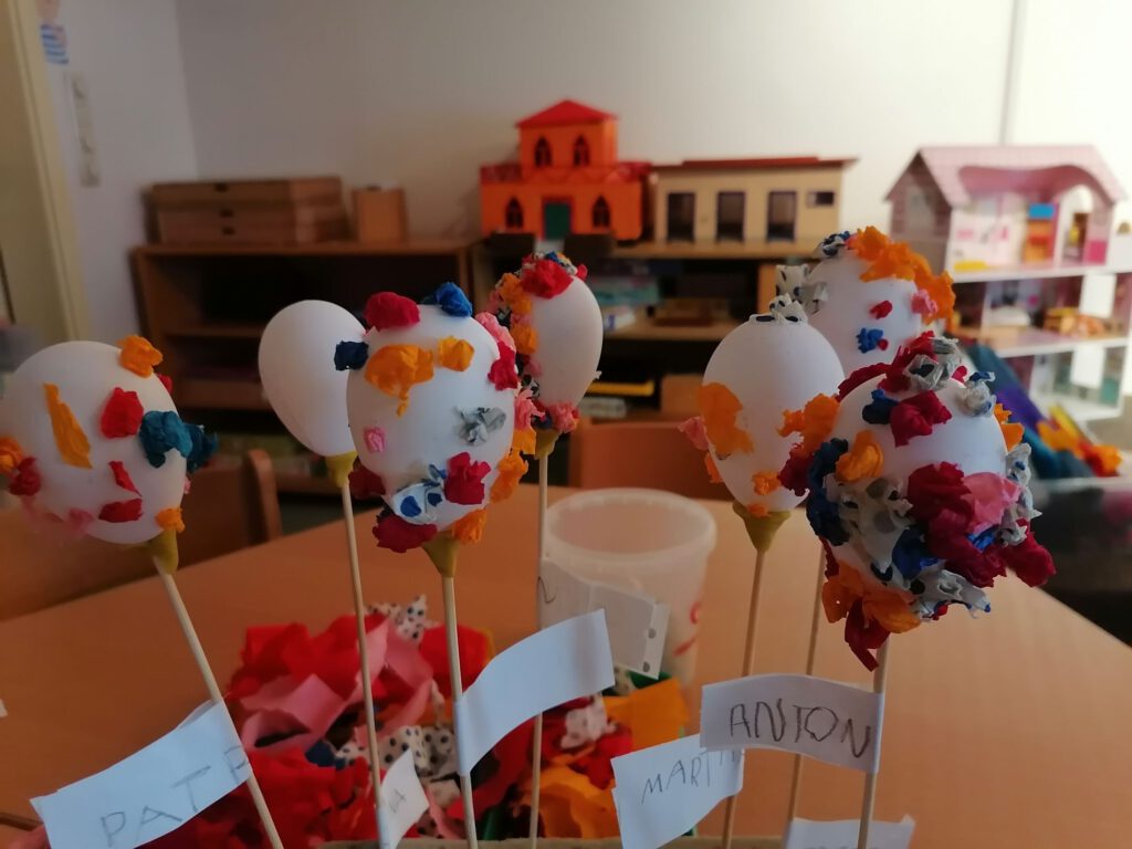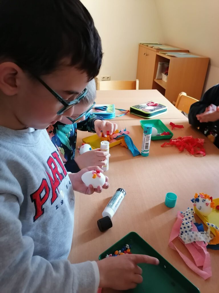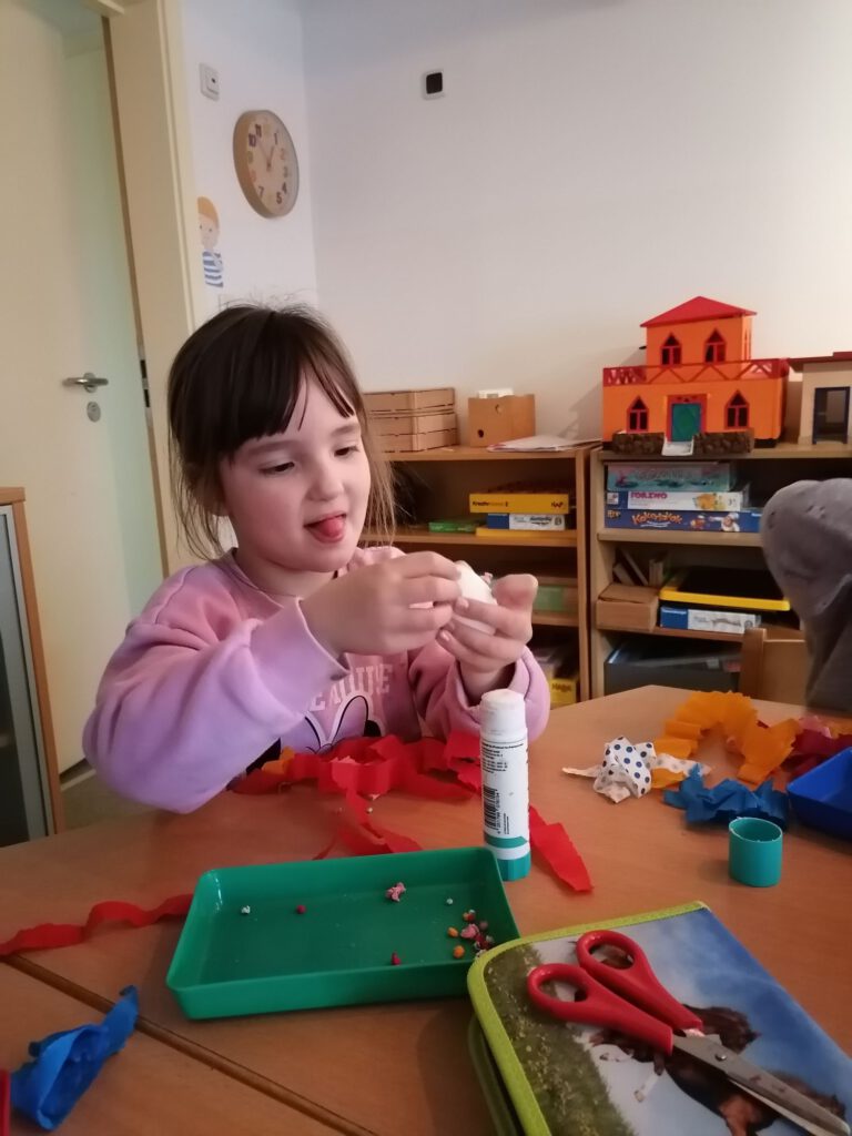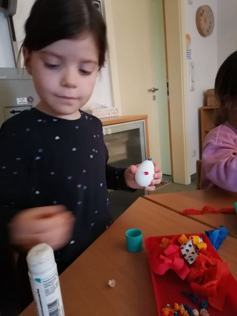 Heute stand eine besonders kreative Aktion in der Wachgruppe auf dem Programm: Gemeinsam wurden Ostereier mit bunten Krepppapierkügelchen beklebt. Mit viel Geduld und Begeisterung formten die Kinder kleine, farbenfrohe Kugeln aus Krepppapier und gestalteten damit ihre ganz eigenen Kunstwerke. Jedes Ei wurde zu einem Unikat – mal kunterbunt gemischt, mal in Lieblingsfarben gehalten.