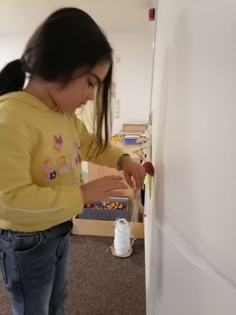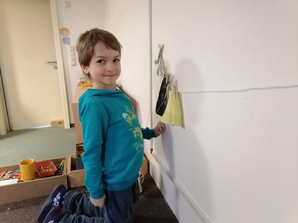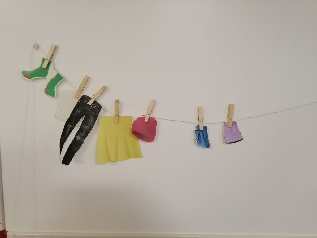Die Kinder hängen farbige Kleidungsstücke an eine Wäscheleine, sortieren diese nach Farben oder Größen und benennen die Kleidungsstücke. Dabei ahmen sie mit viel Freude die Bewegungen des Waschbären nach – sie schrubben, wringen, spülen und hängen die Wäsche auf. Diese Bewegungen unterstützen nicht nur das Textverständnis, sondern fördern auch die Motorik und die Körperwahrnehmung.