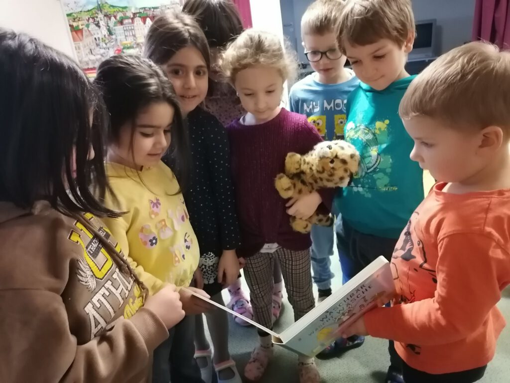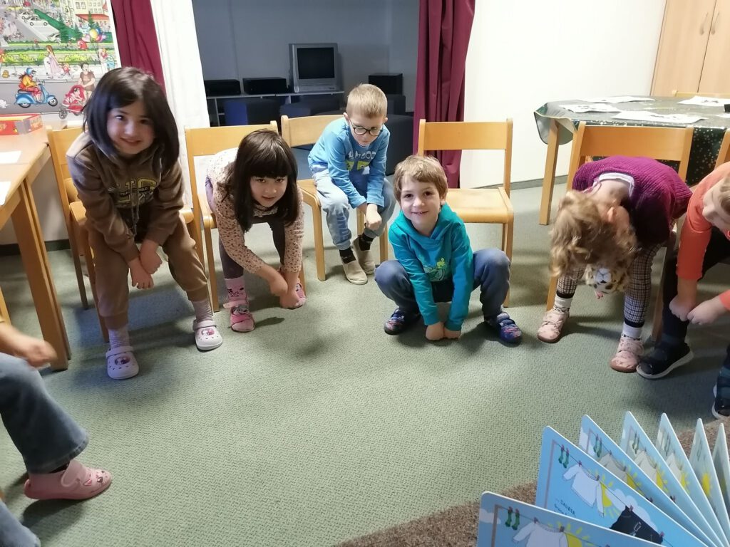 Gemeinsam betrachten die Kinder die Bilder und werden aktiv in das Erzählen eingebunden. Durch gezielte Fragen, Impulse und offene Gesprächsanlässe tauschen sie sich über das Gesehene aus, beschreiben Handlungen und entwickeln eigene Ideen zur Geschichte. So wird die Sprachentwicklung auf natürliche Weise gefördert.