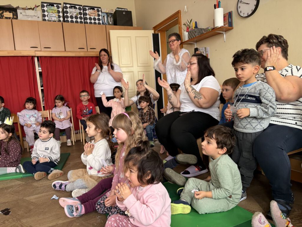 Ein besonderer Höhepunkt war die musikalische Klanggeschichte, die die Familie Bär auf ihrem Weg in den Winterschlaf begleitete. Mit verschiedenen Klängen erlebten die Kinder hautnah, wie sich Mama, Papa und Babybär auf ihre winterliche Ruhe vorbereiteten – ein leises, spannendes und zugleich beruhigendes Erlebnis für alle Sinne.
