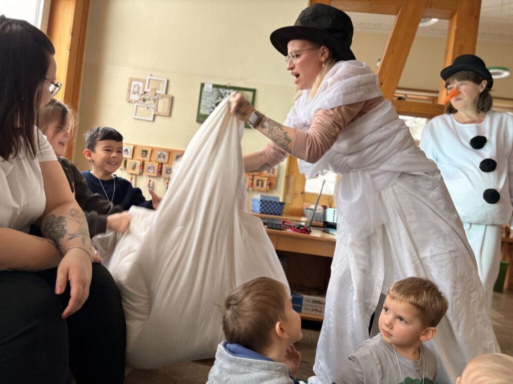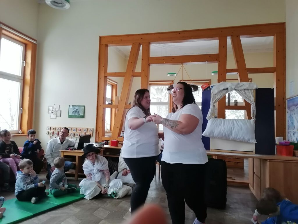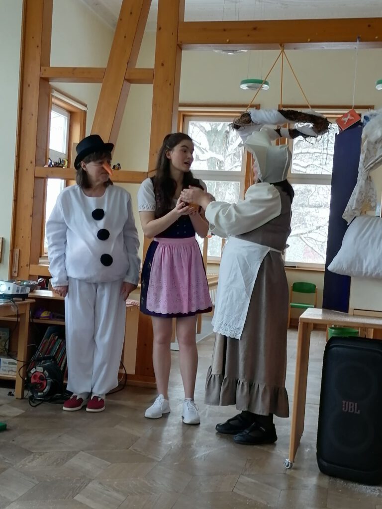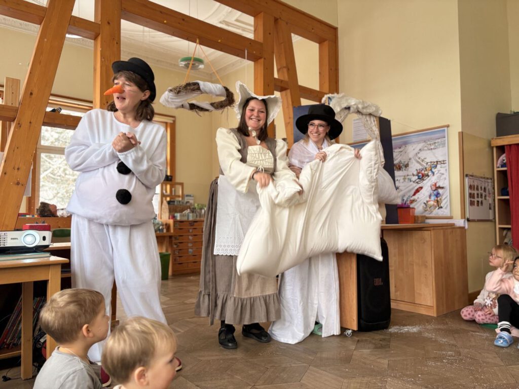Zwischen den einzelnen Programmpunkten tanzten die Schneeflocken wild und leicht durch den Raum. Frau Holle schüttelte gemeinsam mit Marie die Betten am Fenster und ließ sanften Schnee fallen, während Herr Holle mit viel Schwung das ganze Zimmer durcheinanderwirbelte und für ein richtiges Schneegestöber sorgte.