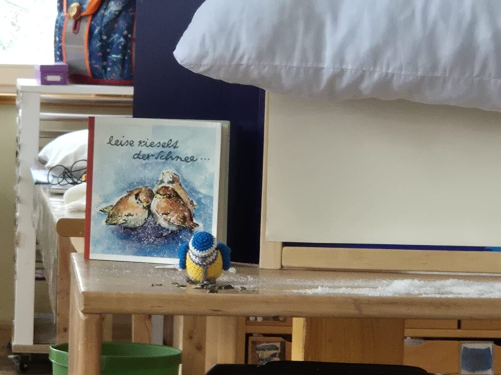 Auch die Tiere im Winter wurden nicht vergessen: Mit großer Fürsorge sorgten alle gemeinsam dafür, dass eine Meise willkommen geheißen und mit leckerem Futter versorgt wurde. Den stimmungsvollen Abschluss des Konzerts bildete ein gemeinsamer Wintertanz, bei dem sich Kinder und Pädagogen fröhlich bewegten und den Winterzauber ausklingen ließen.