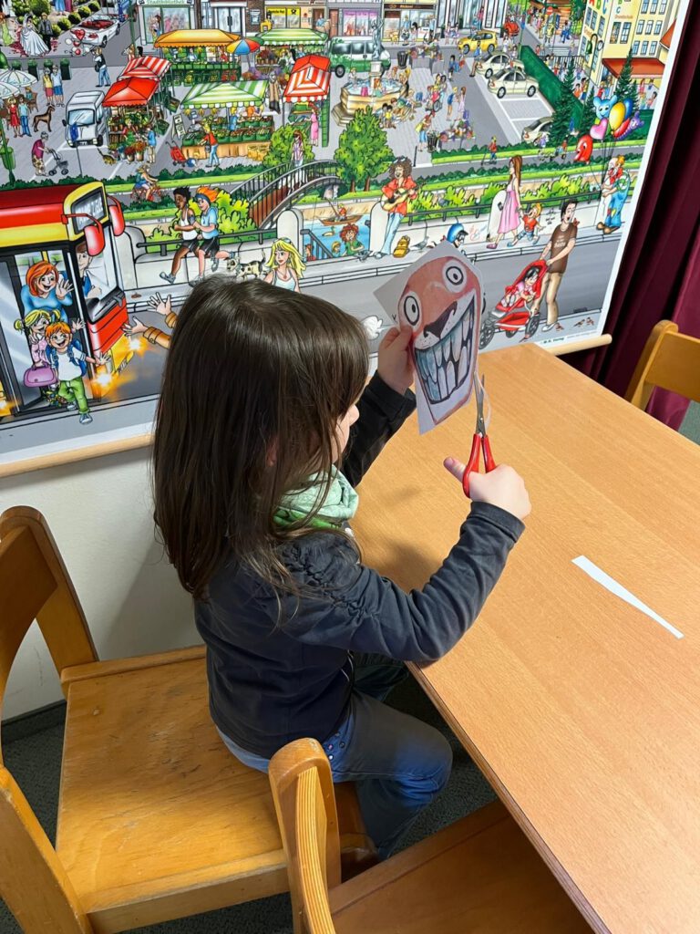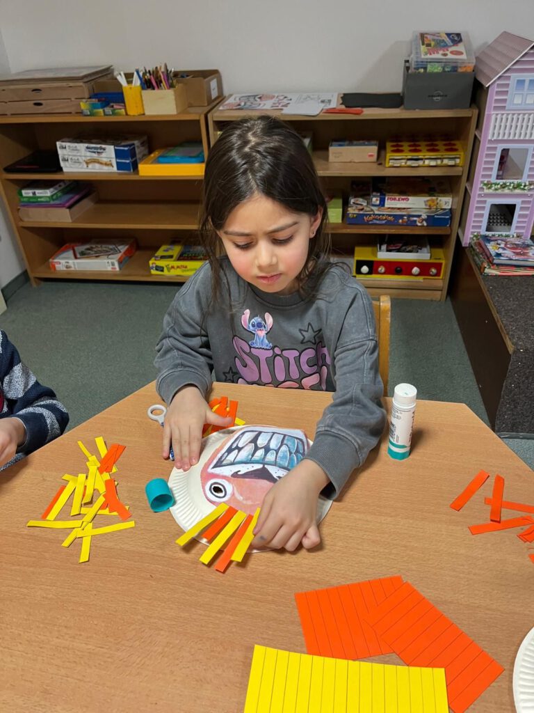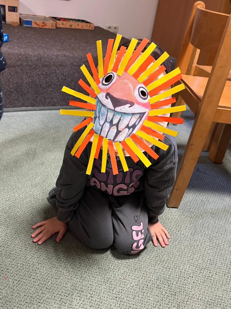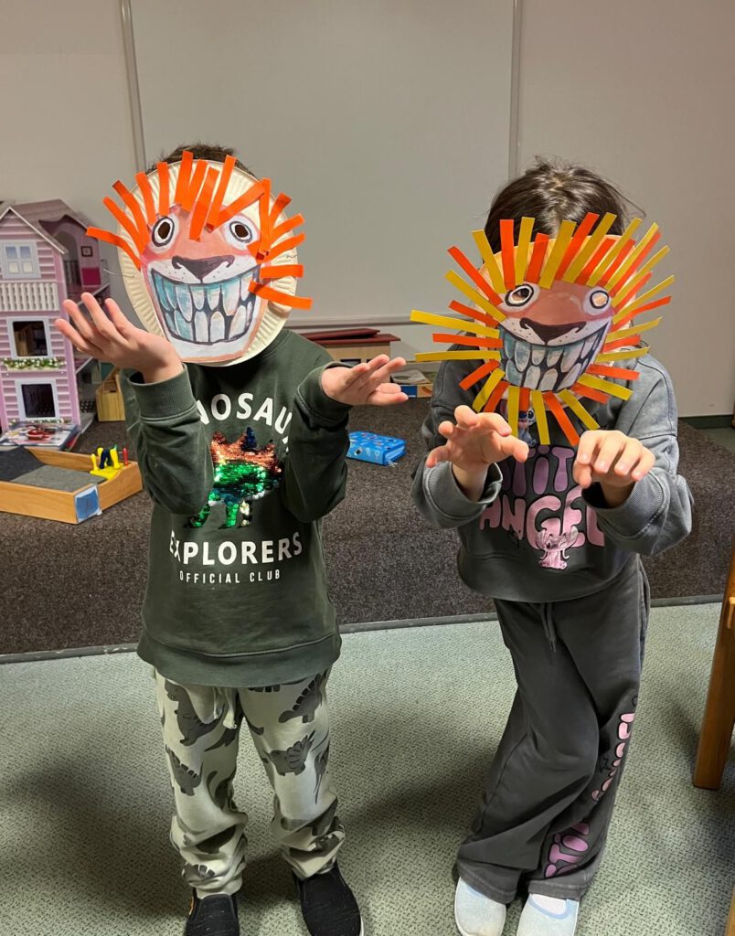 Anschließend streiften viele kleine Löwen durch den Raum und schlüpften voller Stolz in ihre Rollen. Diese kreative Einheit förderte den individuellen Ausdruck, die Feinmotorik sowie das Gefühl der Selbstwirksamkeit: „Ich kann etwas gestalten und in verschiedene Rollen schlüpfen.“